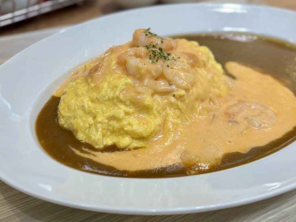 KITTE大阪店限定で提供される エビトマトクリームオムカレー は、今回の目玉メニュー。ふんわり仕上げた卵の内側に、トマトの酸味とエビの旨みを凝縮したクリームソースを合わせ、そこにカレーソースを重ねる構成です。見た目は濃厚ながら、トマトの爽やかさが後味を軽くまとめ、WORLD業態の方向性を象徴する仕上がりと感じられました。