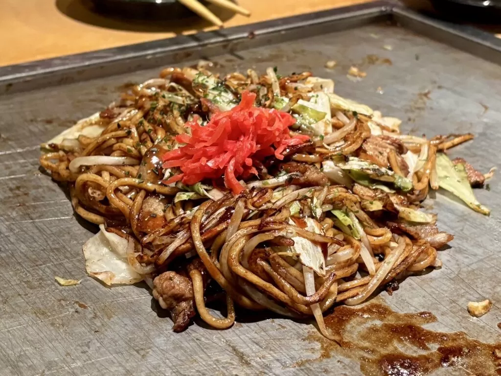 もちもちの中太麺に特製ソースが絡む王道の焼きそばは、粉もんの締めにふさわしい一皿。キャベツや豚肉の旨みがしっかり感じられ、鉄板で焼き上げることで香ばしさが加わる。ソースは甘辛のバランスが絶妙で、食欲をそそる香りが広がる。シンプルながらも満足度が高く、福太郎の鉄板技術が光る定番メニュー。