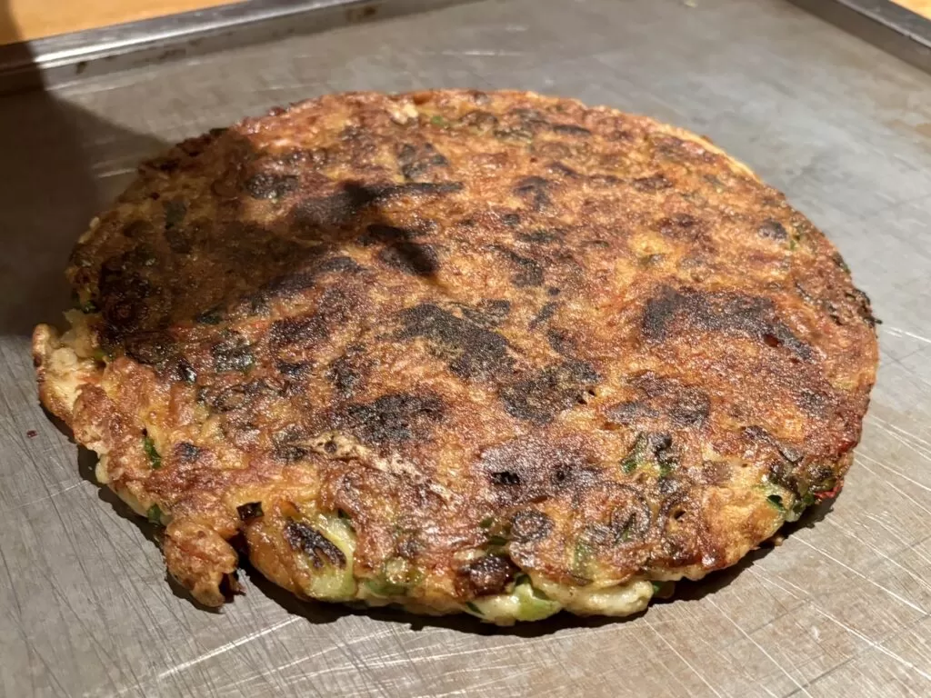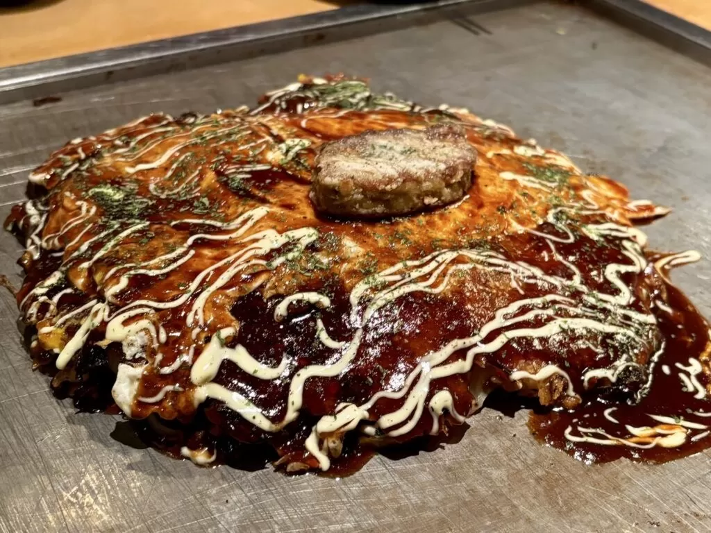 ふわふわの玉子で豚肉を包み込んだ豚平焼きは、関西の鉄板料理の定番。鉄板で焼き上げることで玉子の香ばしさと豚肉の旨みが引き立ち、ソースとマヨネーズのコクが加わって、口の中で絶妙なハーモニーを奏でる。見た目はシンプルながら、食べ応えと満足感が高く、粉もん文化を象徴する一皿として外せない存在。