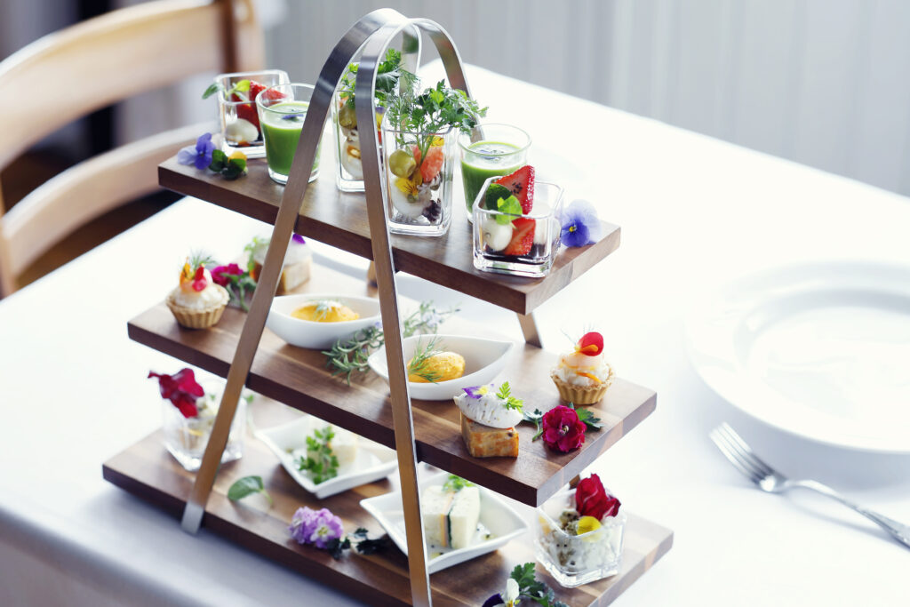 「前菜スタンド~ガーデンからのおもてなし~」は、色彩豊かなハーブガーデンをイメージした前菜を、三段の専用スタンドに盛り付けたスペシャルプレート。メインは肉・魚・パスタから9種の中から選べる贅沢な内容です。
