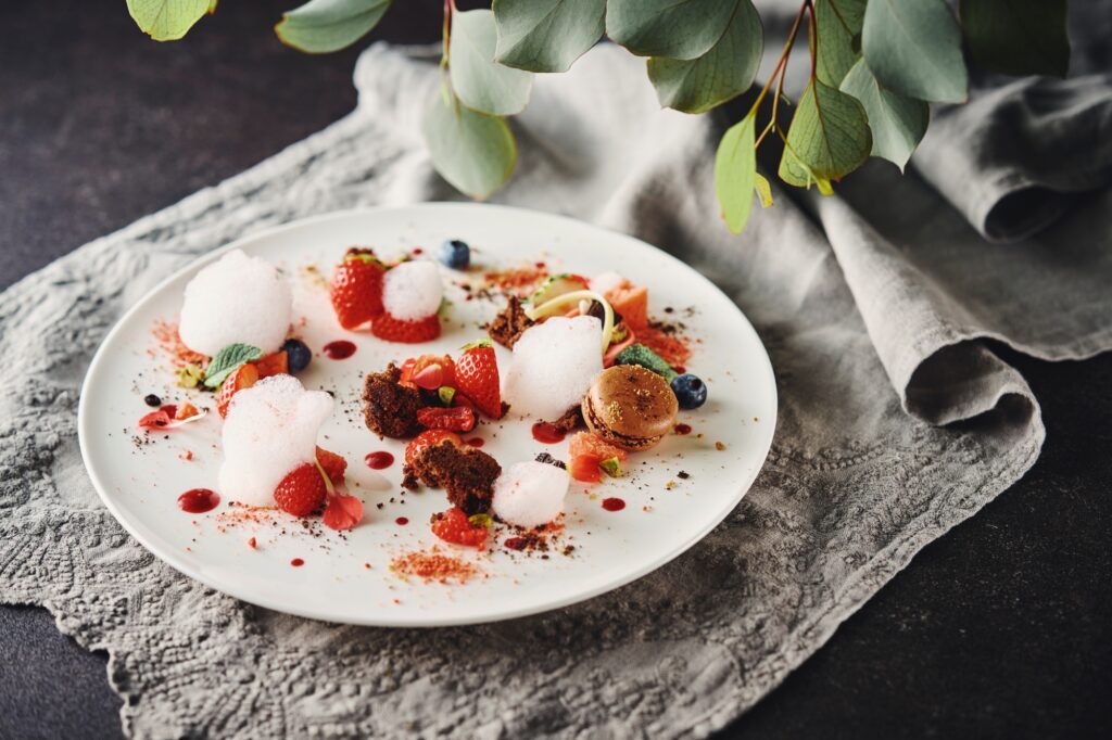季節のクリエーションは、旬のフルーツとチョコレートを重ねた、冬をイメージした一皿。ガトーショコラを主役に、苺マカロンやベリー、泡状のソースやローズの香りを重ね華やかに仕立てています。食感と香りのレイヤードが印象的な、見た目にも楽しいデザートです。