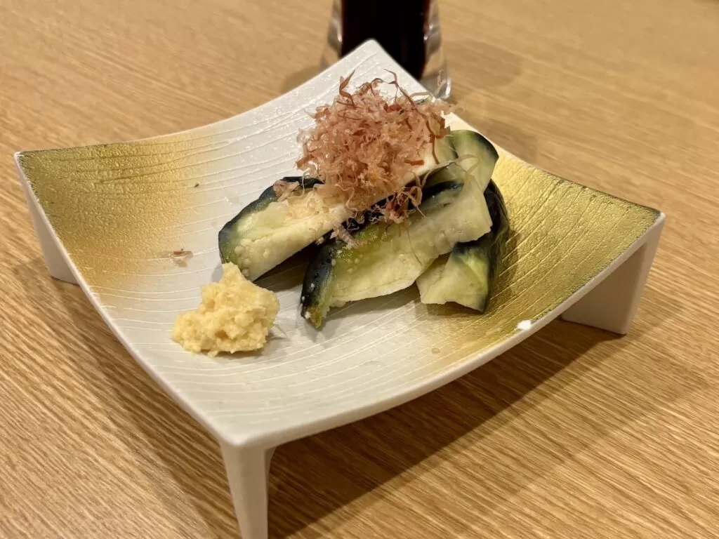 水茄子漬けは、瑞々しくシャキッとした食感が心地よい。ほんのり塩味が効いていて、素材の旨みを引き立てるシンプルな味わいです。 箸休めにもぴったりで、コースの流れにメリハリを与えてくれる一皿。季節感もあり、和食の奥深さを感じさせてくれます。