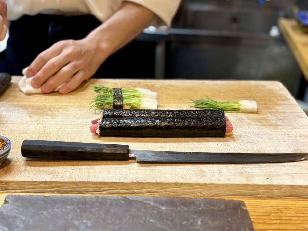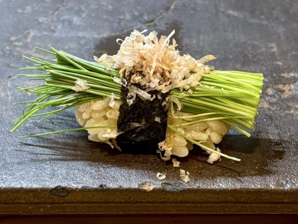 芽ネギは、シャキッとした食感と爽やかな香りが印象的な一貫。赤酢シャリと合わせることで、口の中がリセットされるような清涼感が広がり、コースの締めにふさわしい存在感を放つ。見た目の美しさと香りの爽快さが際立ち、鮨体験の余韻を整える役割も果たす。濃厚なネタが続いた後に、軽やかで清々しい味わいが心地よく、五感で味わう鮨の締めくくりにぴったりの一皿。