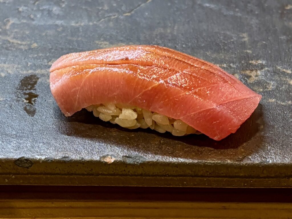 中トロは、脂の乗りと赤身の旨みが絶妙なバランス。口の中でとろけるような食感がありながら、後味はすっきりと心地よい。赤酢シャリが脂を程よく引き締め、鮨まつ井ならではの洗練された一貫に。見た目の艶やかさも美しく、握りの技術と素材選びのセンスが光る、王道ながらも完成度の高い一品。