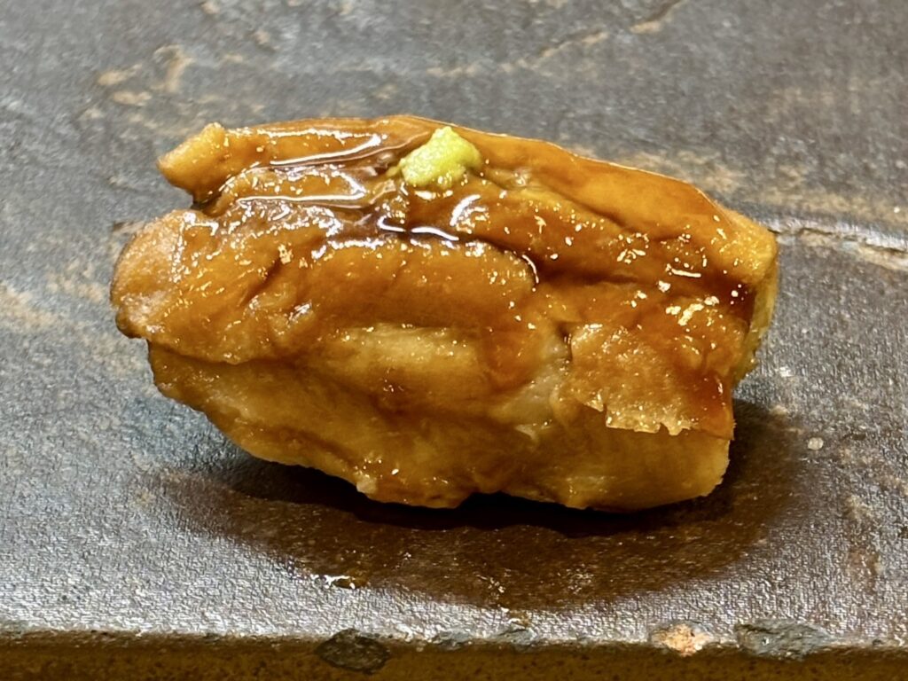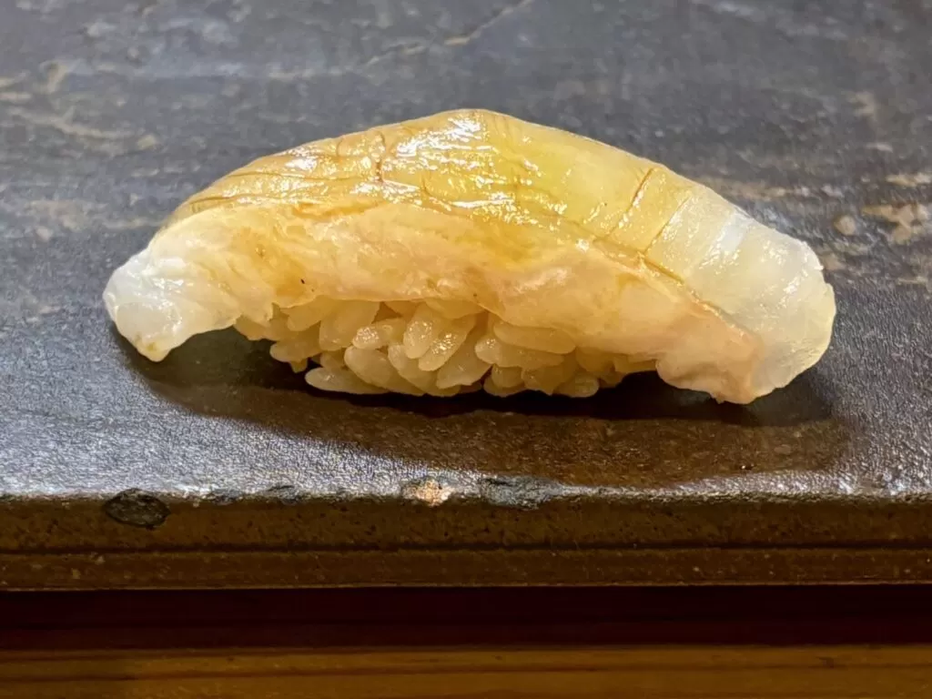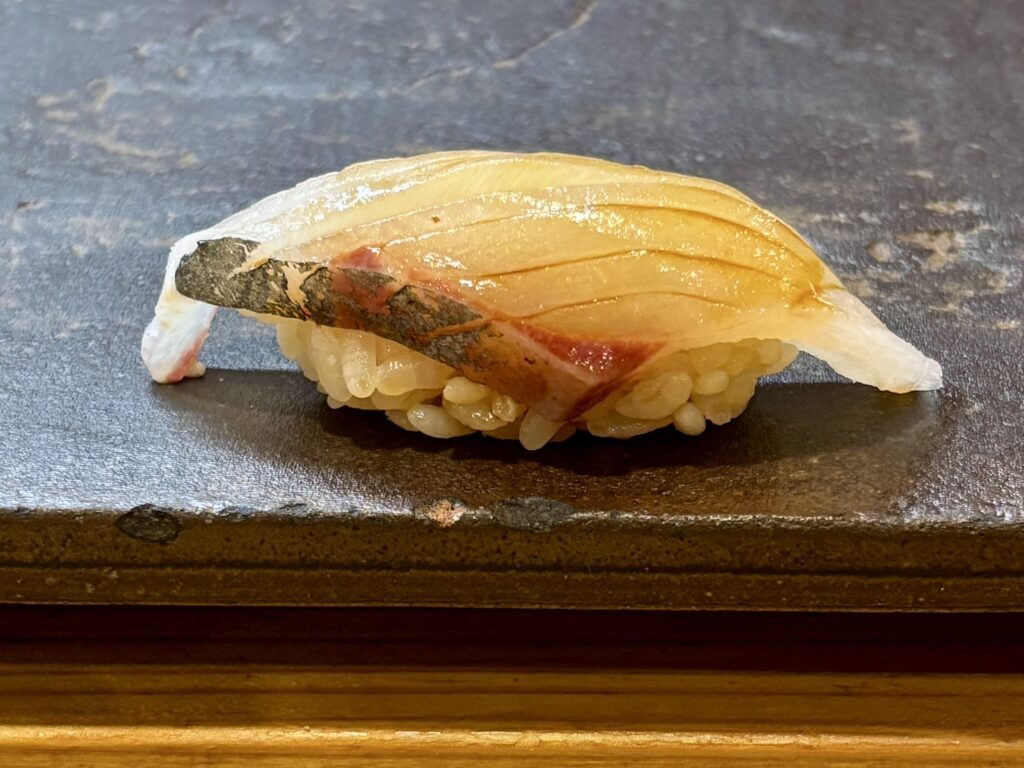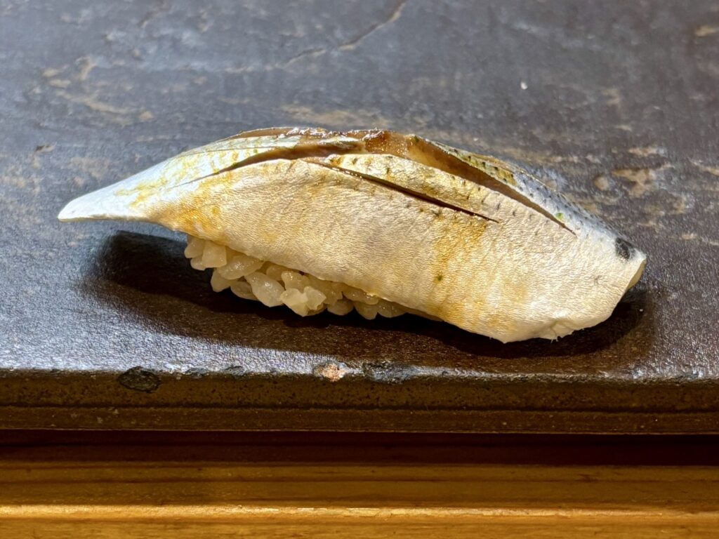 縞鯵は、しっかりとした歯ごたえと脂の乗りが魅力。赤酢シャリと合わせることで、力強い旨みがより際立ち、噛むほどに味が深まる。鮮度の高さが感じられ、皮目の香ばしさと身のコクが絶妙に調和。職人の包丁技と握りの圧が絶妙で、食べ応えと繊細さを両立した一貫に仕上がっている。