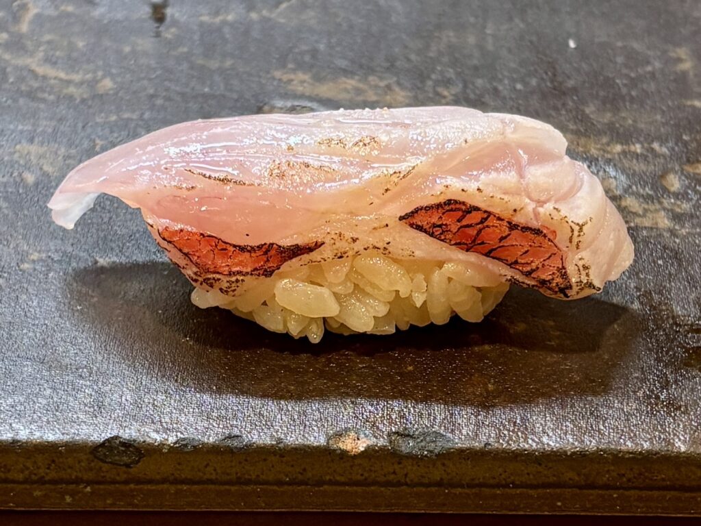 金目鯛は、脂の乗った身質と柔らかな食感が特徴。赤酢シャリと合わせることで、上品な甘みとコクが際立ち、見た目も華やか。皮目の香ばしさと身のとろけるような質感が絶妙に融合し、握りの美しさと味の深みを兼ね備えた一貫。季節感と贅沢感を感じさせる、記憶に残るひと口。