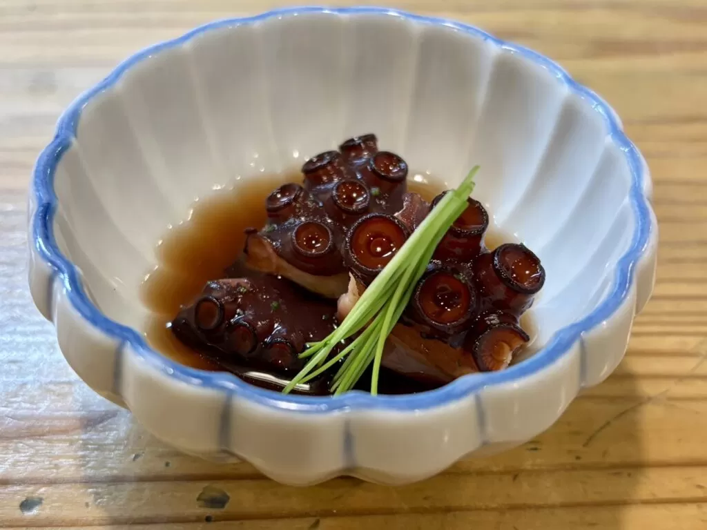 コースの幕開けを飾る「タコの柔らか煮」は、しっとりとした舌触りと、噛むほどに広がる出汁の旨みが印象的。煮込みすぎず、絶妙な火入れでタコ本来の風味を活かした一品は、優しい味わいで胃を整え、鮨への期待感を静かに高めてくれる。見た目の美しさと、職人の丁寧な仕事ぶりが感じられる前菜で、まさに“鮨体験の序章”にふさわしい一皿。
