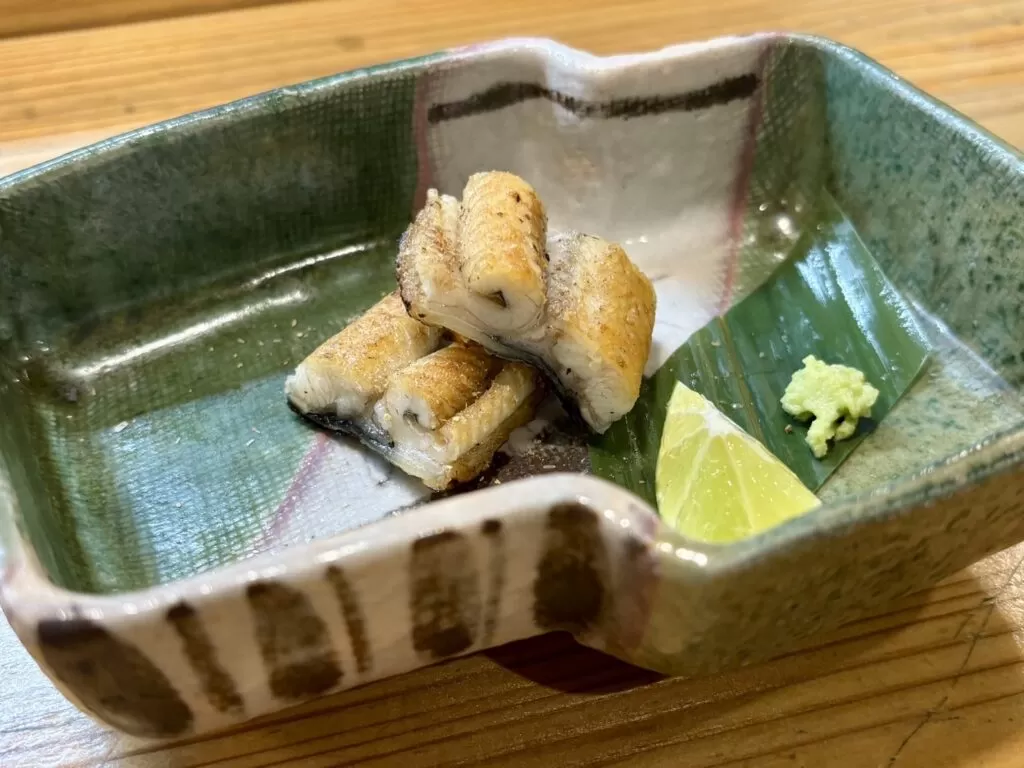 焼き物の「鰻の白焼き」は、皮目の香ばしさと身のふっくら感が絶妙。タレを使わず塩で仕上げることで、鰻本来の旨みが際立ち、日本酒との相性も抜群。脂の乗りも程よく、口の中でとろけるような食感が印象的。握りの前に味わうことで、食の流れに深みが生まれ、コース全体の構成美を感じさせる一品。