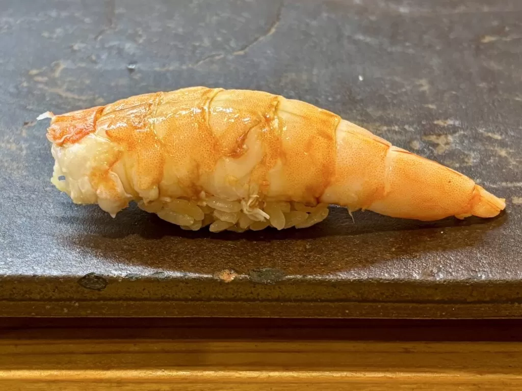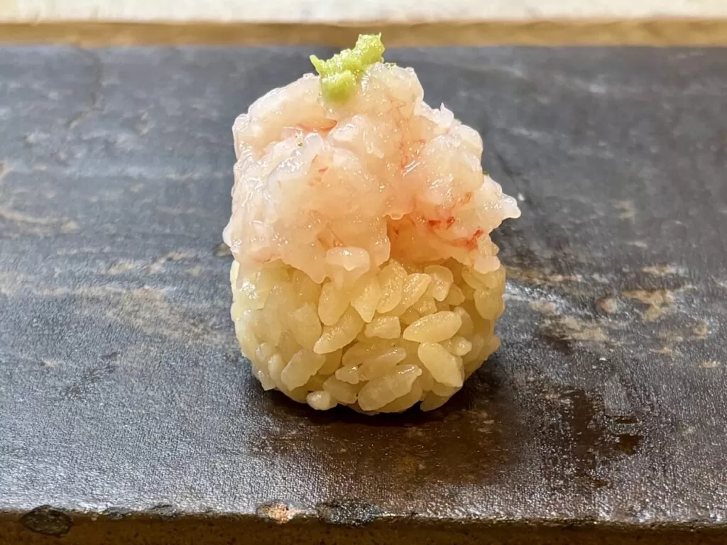 甘えびは、とろけるような食感と濃厚な甘みが口いっぱいに広がる一貫。赤酢シャリが甘みを引き締め、バランスの取れた味わいに。鮨まつ井の丁寧な仕事が感じられる、贅沢なひと口で、見た目の美しさも印象的。口に含んだ瞬間、えびの香りと旨みが広がり、余韻まで美しい仕上がり。