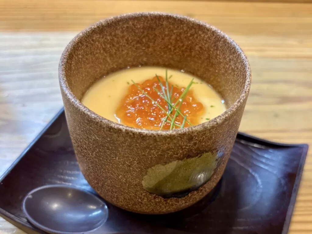 「茶碗蒸し」は、出汁の香りと滑らかな舌触りが際立つ一品。具材のバランスも良く、優しい味わいが心を落ち着けてくれる。温度感と香りの演出が絶妙で、コースの終盤にふさわしい癒しの一皿。口に含んだ瞬間に広がる出汁の旨みが、鮨体験の余韻を優しく包み込む。派手さはないが、職人の丁寧な仕事が感じられる、静かな満足感をもたらす料理。
