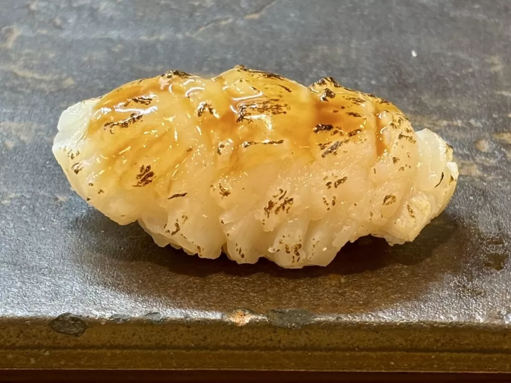 炙りホタテは、香ばしさと甘みの融合が魅力。表面を軽く炙ることで旨みが引き立ち、赤酢シャリとの相性も抜群。口の中でとろけるような食感があり、香りの余韻も楽しめる。火入れの加減が絶妙で、素材の持つ甘みと香ばしさを最大限に引き出した、職人技が光る一品。