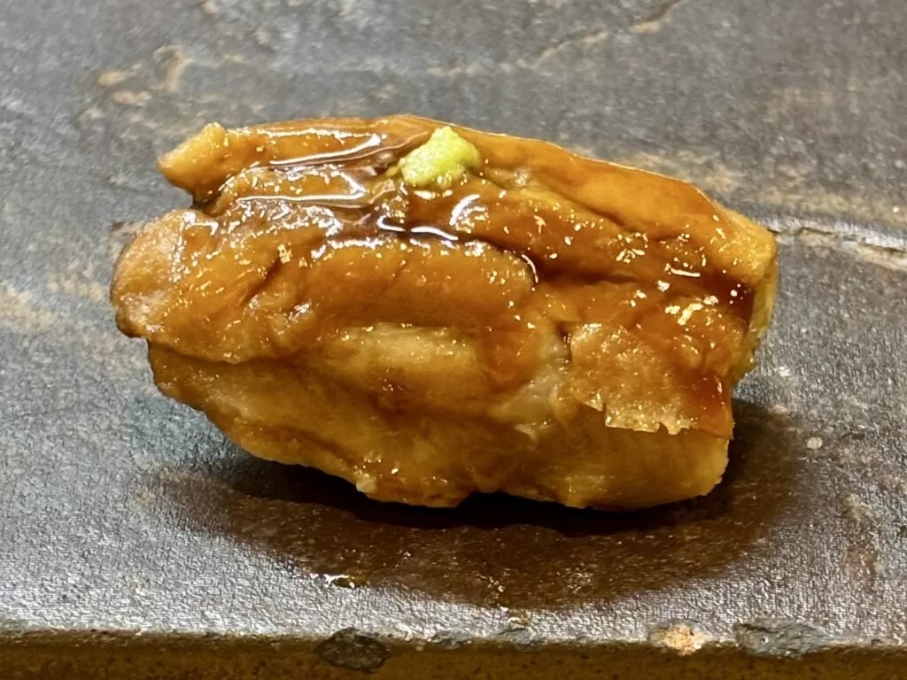 穴子は、ふっくらとした身と香ばしい焼き目が印象的。タレを使わず塩で仕上げることで、素材本来の旨みが際立ち、赤酢シャリと合わせることで軽やかで上品な味わいに。口の中でとろけるような食感と、焼きの香ばしさが調和し、鮨まつ井らしい繊細な仕上がりが感じられる。