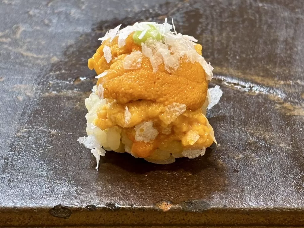 うには、濃厚でクリーミーな旨みが口いっぱいに広がる一貫。赤酢シャリがその濃厚さを引き締め、後味まで美しく整えられている。鮮度の高さが際立ち、贅沢感のある仕上がりで、口に含んだ瞬間に広がる香りと旨みが印象的。見た目も華やかで、コースの中でも特に記憶に残る一皿。