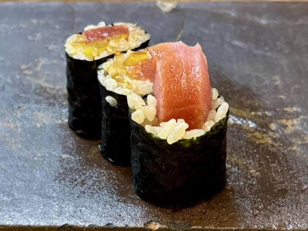 締めの一品「トロたく」は、脂の乗ったトロと香り高いたくあんのバランスが絶妙。巻きの技術も美しく、口の中で旨みと食感が心地よく交差する。海苔の香りと赤酢シャリの酸味が調和し、握りの余韻を引き立てる構成。鮨まつ井らしい繊細さと遊び心が感じられ、最後まで鮨体験を楽しませてくれる。見た目の端正さも印象的で、巻物の完成度の高さが光る一皿。
