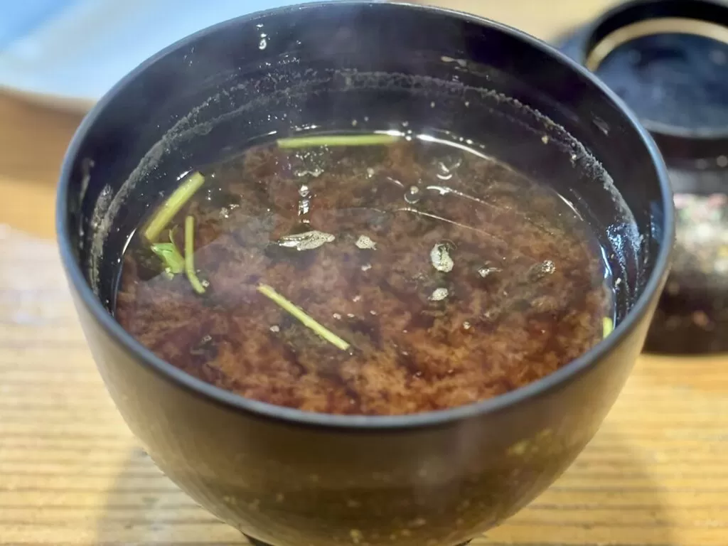 締めの椀物「あおさの赤だし」は、あおさの香りがふわっと広がる上品な仕上がり。濃すぎず、鮨の余韻を邪魔しない絶妙な味加減で、最後まで満足感を保ってくれる。赤酢シャリとの流れを壊さず、口の中を穏やかに整える役割も果たす。香り・温度・味のバランスが整った一杯で、鮨まつ井のコースを心地よく締めくくる。
