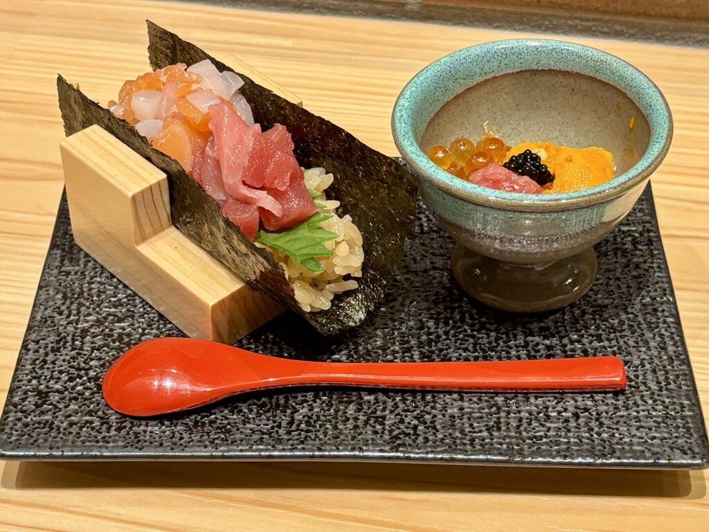 「やま幸」本マグロや鮮魚を巻いたロールに、中落ち・ウニ・イクラ・キャビアが別添えで登場。