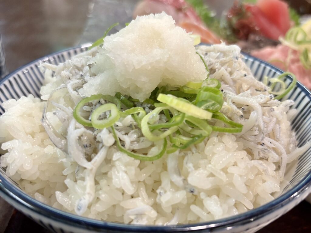 ふっくらと炊き上げたご飯に、しらすの旨みが重なり、口当たりは軽やか。刺身の余韻を邪魔せず、むしろ後味を整える役割を果たします。