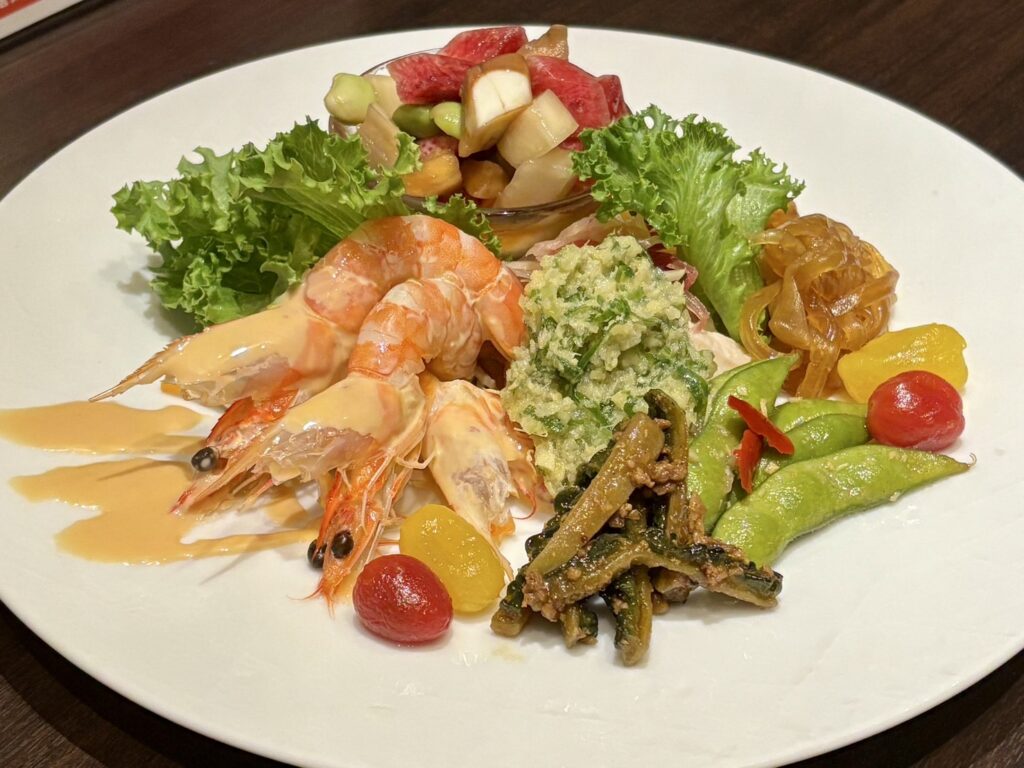 まず登場したのは、シェフのお任せ前菜3種盛り合わせ。この日は、クラゲの冷菜、蒸し鶏の葱ソース、季節野菜のピクルスが並びました。どれも素材の持ち味を活かした繊細な味付けで、四川料理のイメージを覆すような爽やかなスタート。特に蒸し鶏は、香味油の香りとしっとりとした食感が絶妙でした。