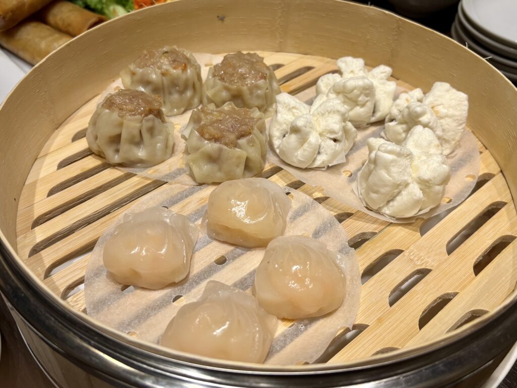点心三種類盛り合わせ:海老蒸し餃子、叉焼包、焼売