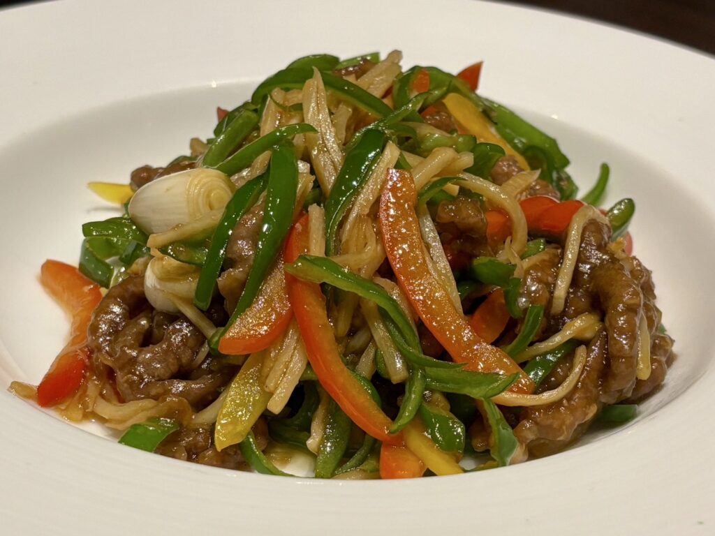 青椒牛肉絲は、細切り牛肉とピーマン、筍を炒めた定番中華。牛肉は柔らかく、野菜はシャキシャキ。オイスターソースと豆板醤のバランスが良く、辛味は控えめながらもコク深い味わい。ご飯が欲しくなる一品で、食欲をさらに刺激します。