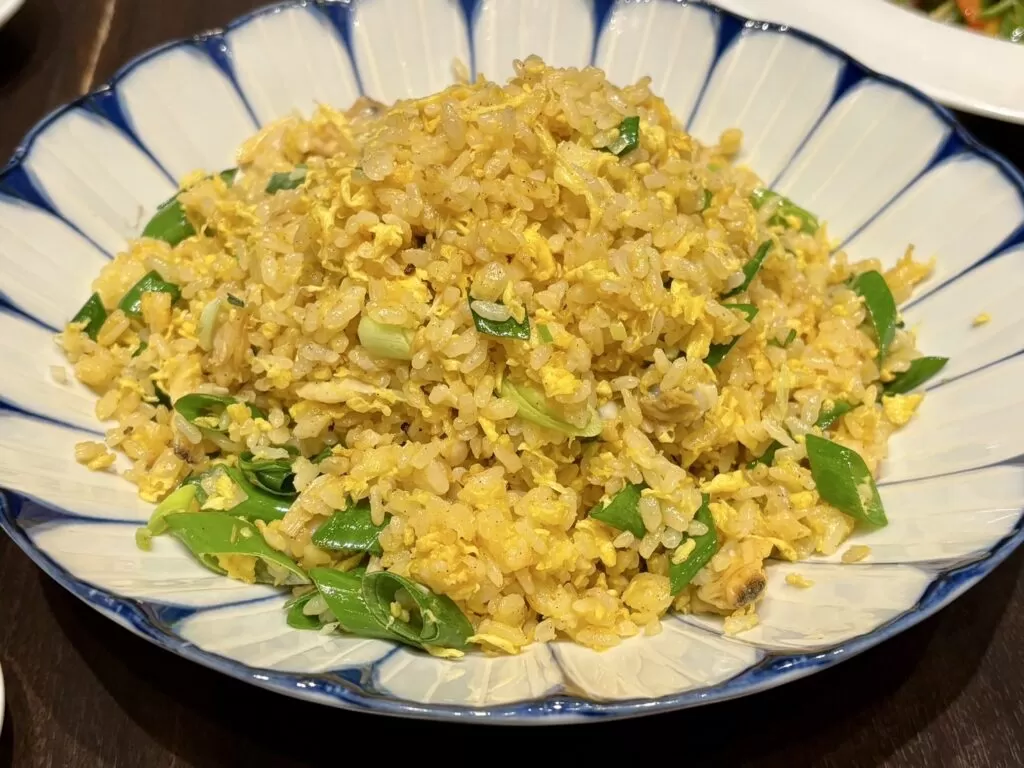 締めは本日の炒飯。この日は干し海老と青菜を使ったシンプルな炒飯でしたが、米の粒立ちと香ばしさが際立ち、麻婆豆腐の余韻を受け止めるような優しい味わい。油の使い方も軽やかで、最後まで重たさを感じさせない仕上がりです。