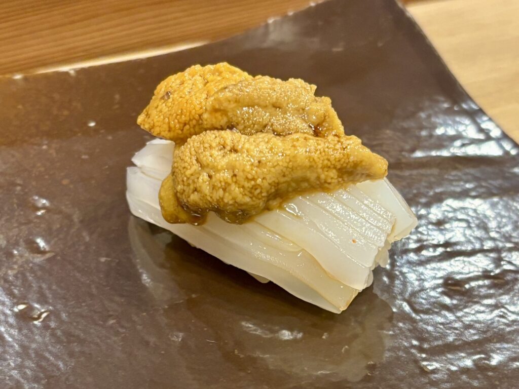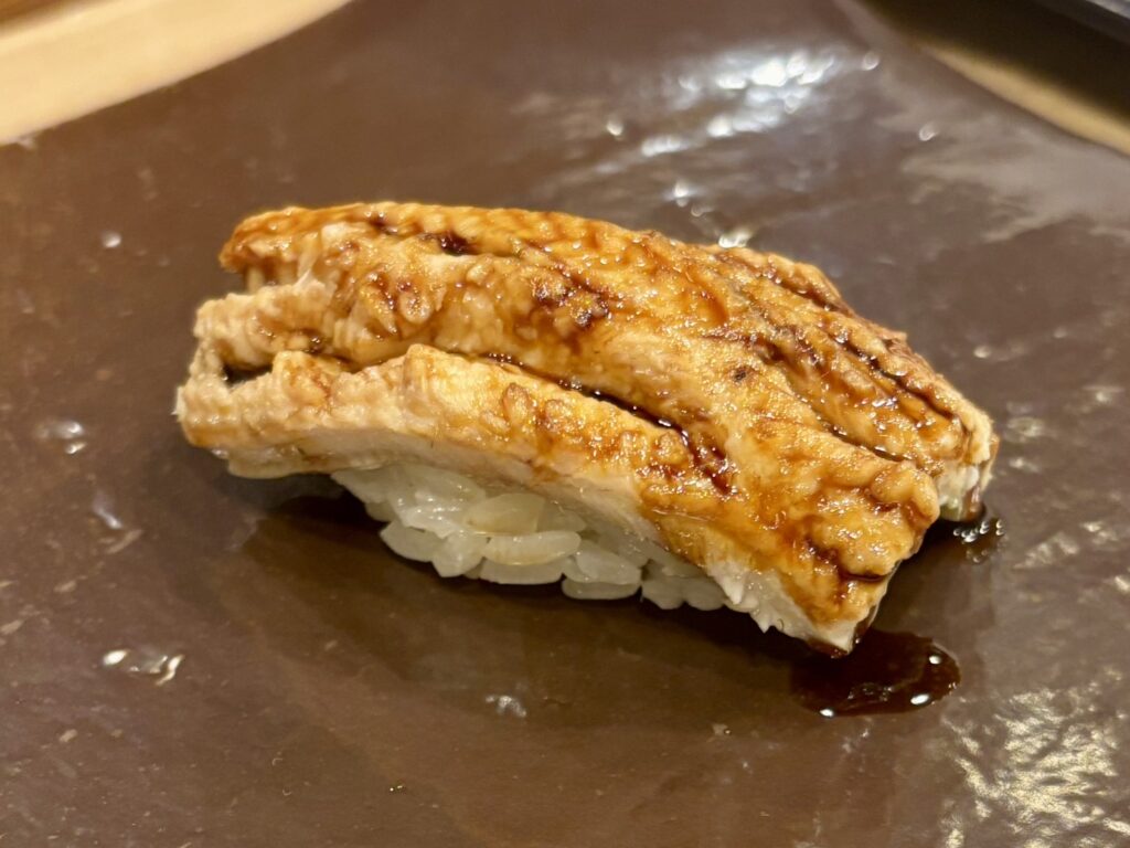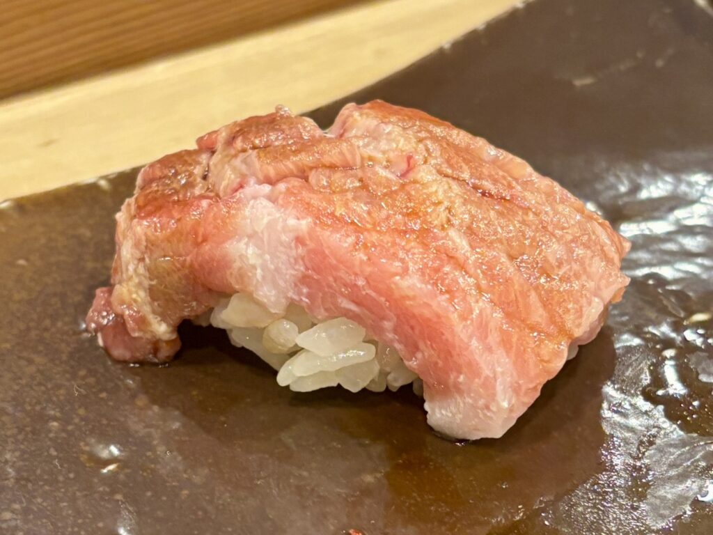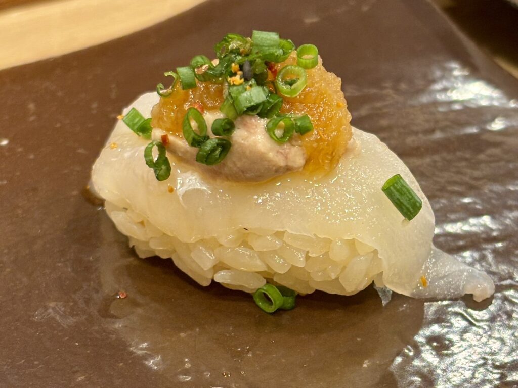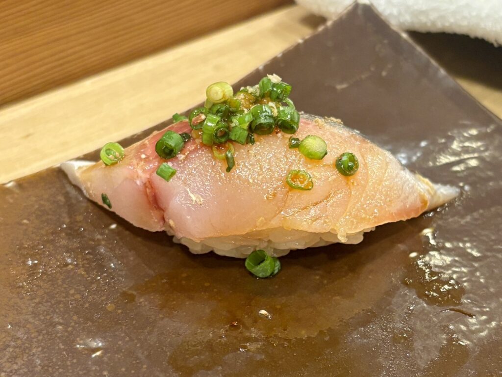 かんぱちは、しっかりした身質とほどよい脂が調和した味わい。噛むと旨味がじんわり広がり、後味はすっきりとした清涼感。鮮度の良さがそのまま味に現れる一貫で、寿司全体の流れに心地よいアクセントを添えてくれます。塩や柑橘との相性も抜群です。