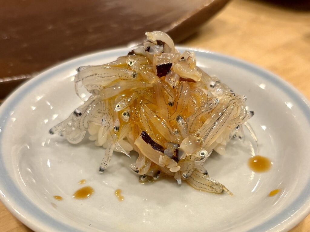 鯵は鮮度が命ともいわれるネタ。越中屋の鯵は脂のりがよく、身質もしっとり。口に入れた瞬間、青魚ならではの香りと透明感のある旨味が広がり、思わず頬が緩むおいしさです。薬味の使い方も上品で、鯵の魅力をまっすぐ引き出した仕上がりです。
