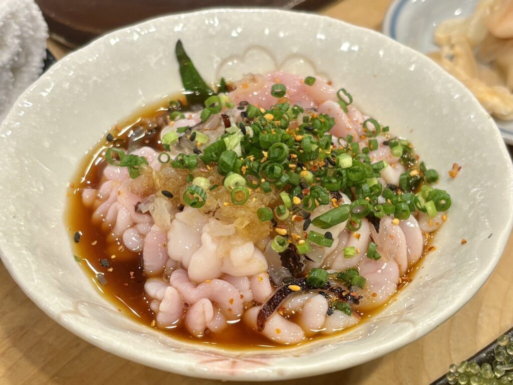 白子ポン酢は、濃厚な白子が舌の温度でとろけ、ポン酢の酸味が軽やかに整える一皿。白子の旨味を引き締める香りも心地よく、贅沢な味わいを手軽に楽しめる酒肴として非常に完成度が高い品です。冬場は特に人気の高い定番です。