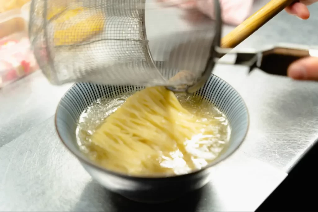 麺は、この鯛スープのためだけに開発された特注ストレート細麺。麺線の美しさが際立つ盛り付けはまるで日本庭園のようで、味だけでなく視覚でも楽しませてくれます。