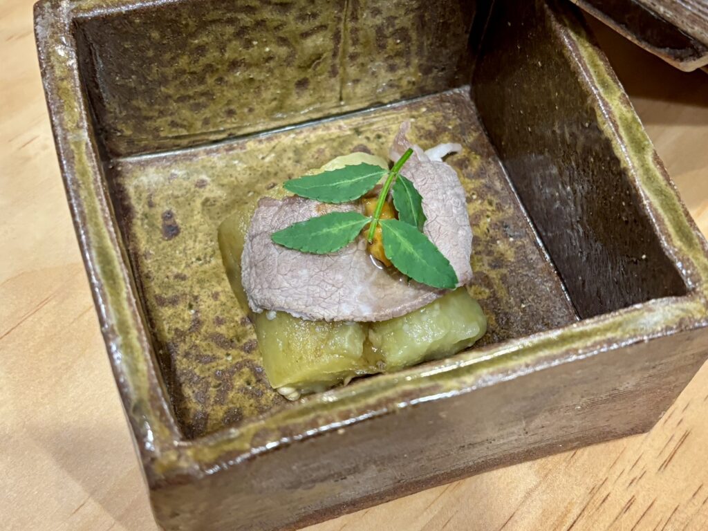 うにのコクが前に出つつ、燻製の香りが輪郭をつくり、茄子が全体をまろやかに受け止めます。濃厚なのに重くないのは、香りの設計が丁寧だから。香りの立体感が記憶に残る一品です。